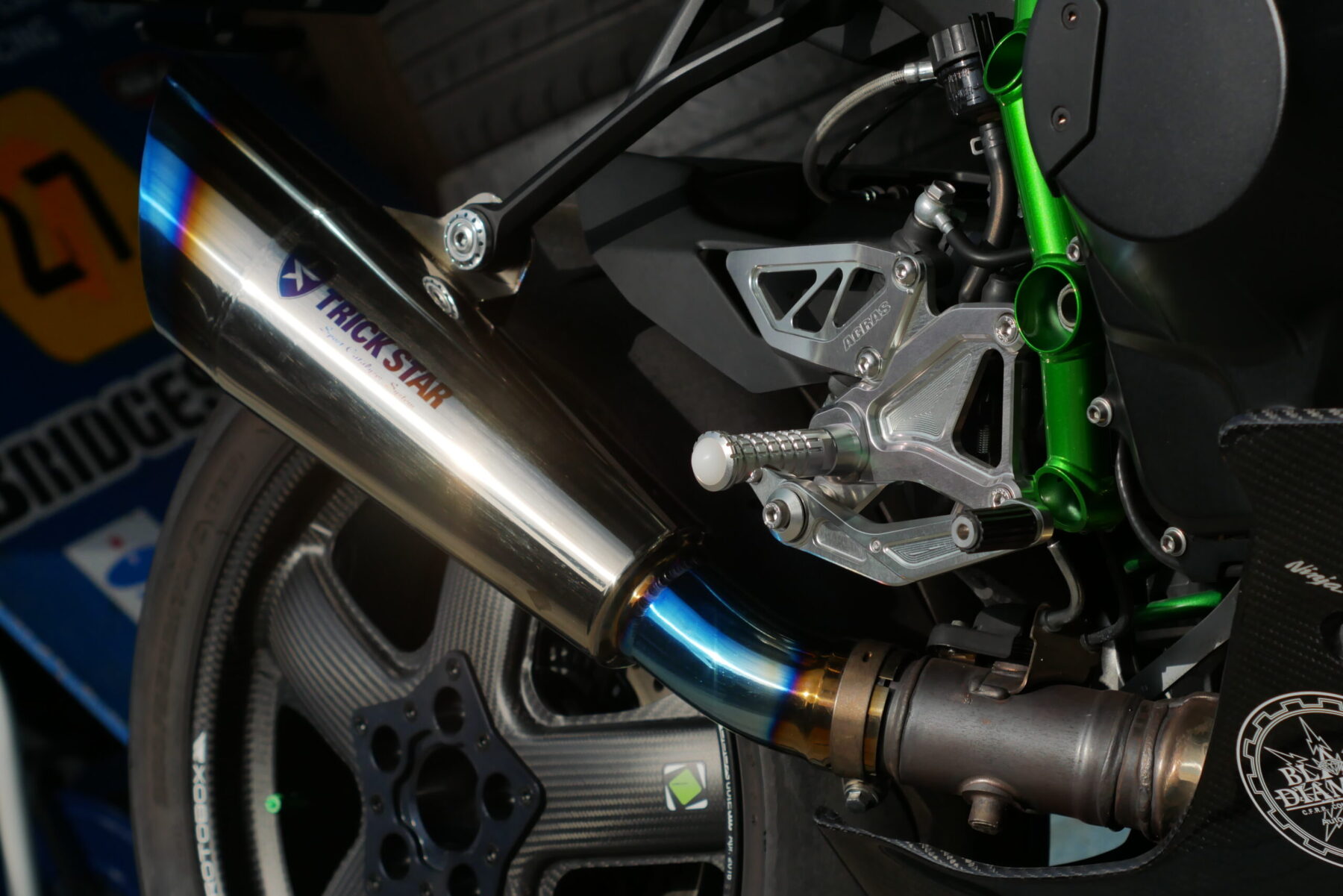 そのほか、エンジンブレーキの挙動を最小限にするためのバックトルクリミッターを備え、エンジン中枢部のカスタムから、外装品までしっかりと手が加えられた一台です。