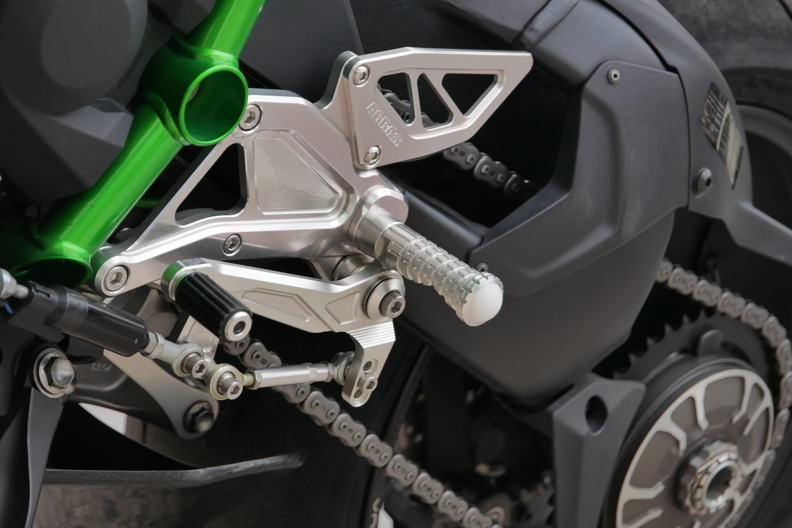 見どころは ROTOBOXのカーボンホイール、そしてフロントフォークはSHOWAの技術力が詰まったBFF(バランスフリーフォーク)へ換装。BFFはフォーク内の圧力偏差を極力排除した、性能の安定、応答性が大変良いフォークです。フリクションが非常に低いため、低速でのスムーズな動きから、サーキットなどでの高速高加重な動きまで不安なく走らせることが可能です。