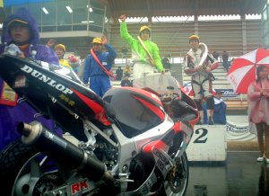 マシンの仕様は、WITH MEオリジナルのフルEXとFAL.CONを装着、タイヤをダンロップD207GPに変更したのみの状態。それ以外は、ライトもついたまま。ブレーキホースまでノーマルのままである。当日はあいにくの雨にもかかわらず、ライダーの神山選手、マシン共に絶好調!結果は、2位のCBR900RRに20秒以上の大差をつけての独走劇。見事にデビューウィンを飾ったのである。