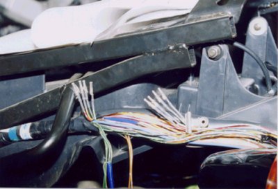 K 写真は、切断したハーネスにカプラを取付し、一度ノーマル状態に戻してみたものです。 端子にカプラを取付する前に各配線の取り回しを決めておきます。ECUを一度元の場所に置き、メインハーネスも元の取り回しに戻します。写真のようにECU側の配線4本は独立してまとめて下さい。 今まで通りの配線と一緒にまとめてしまいますと、取り付けしたカプラ同士が届かず、ノーマル状態に戻せなくなってしまいます。必ずカプラ取付前に無理のない取り回し(引っ張られたり、折れ曲がりが無い)を決めて下さい。