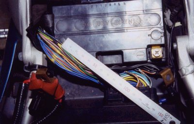C ECMカプラ左側(進行方向で見た場合)根元部分より約10センチ離れた部分、配線の束ごとマーキングして下さい。