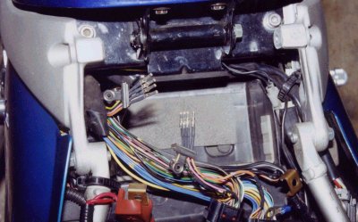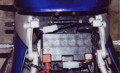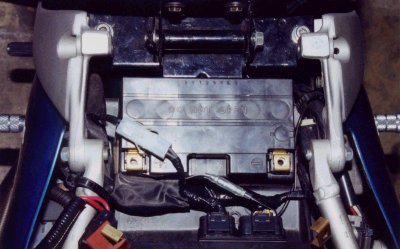P 加工は以上で終わりです。メインハーネスやカプラを取り付けした配線に絶縁テープなどでまとめます。(加工したアース線は出しておきます。) ハーネスのとりまわしを元に戻し、バッテリーを乗せた状態で取り付けしたカプラ同士が届くことを確認して下さい。(ノーマル状態に戻せることを確認します。)カプラをつなぎノーマル状態 にしたところです。
