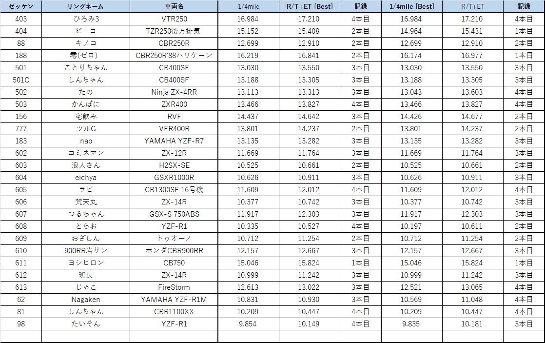13:00 走行(3本目走行)【1/4マイル=約402mのタイム計測】