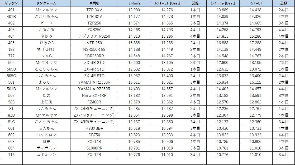 14:30 走行(4本目走行)【1/4マイル=約402mのタイム計測】