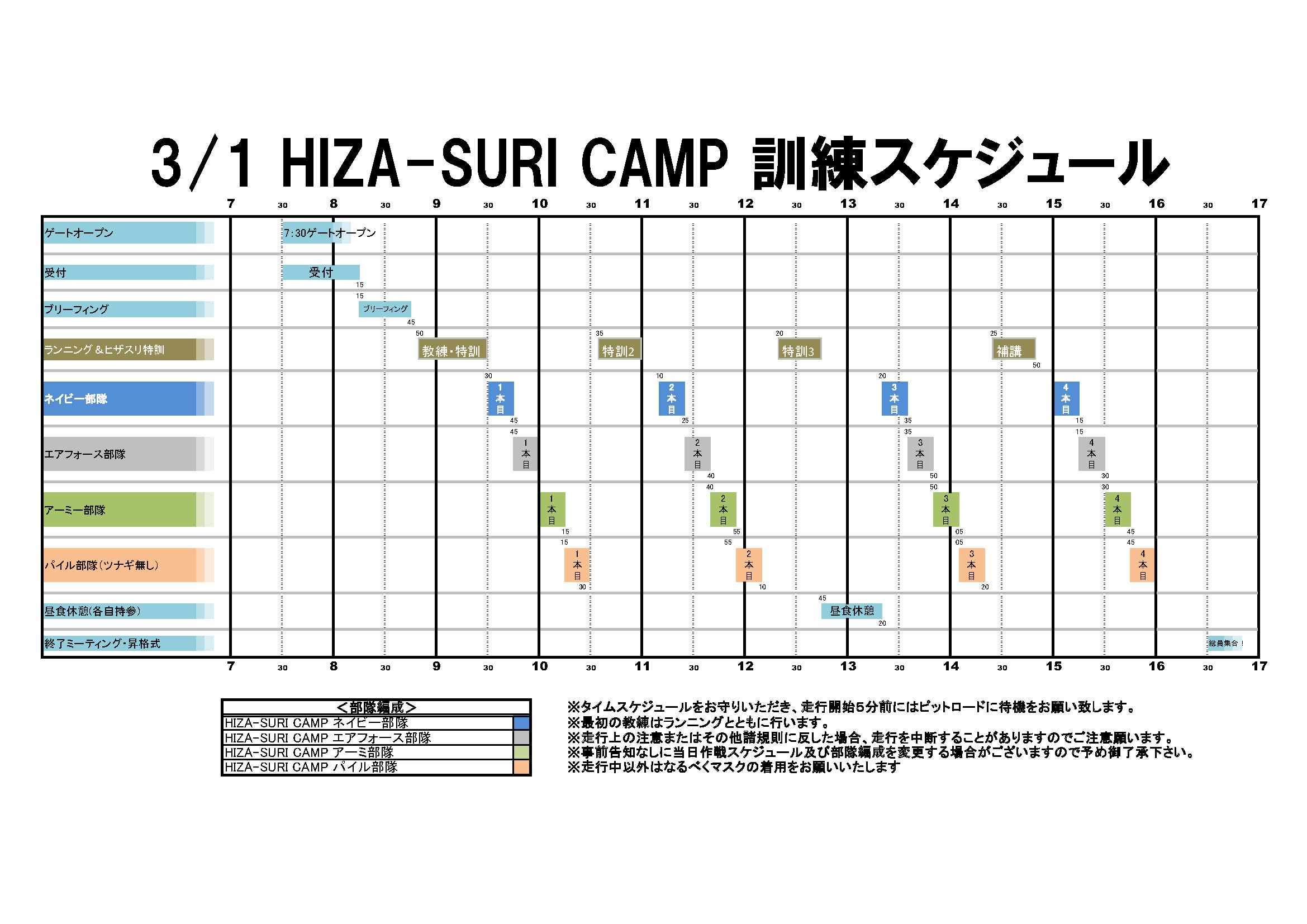 パイルはアーミーを、アーミーはネイビー/エアフォースへの所属を目標に自分がレベルアップしていくことをHIZA-SURI CAMPで感じてほしい。ネイビーとエアフォース所属の隊員は皆のお手本なのだ。 大丈夫だ、諸君。俺にくっついてこい。ただついてくればいい。 俺がヒザを擦らせてやる。